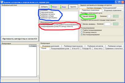 Не следует также пренебрегать такими параметрами, как «делать проверку минимального угла». Иначе время ожидания окончания работы алгоритма будет порядка нескольких десятков минут (иногда, больше). Значения минимального угла и максимальной площади рекомендуется устанавливать на основе опыта, полученного при выполнении П.4 курсовой работы 8-го семестра.