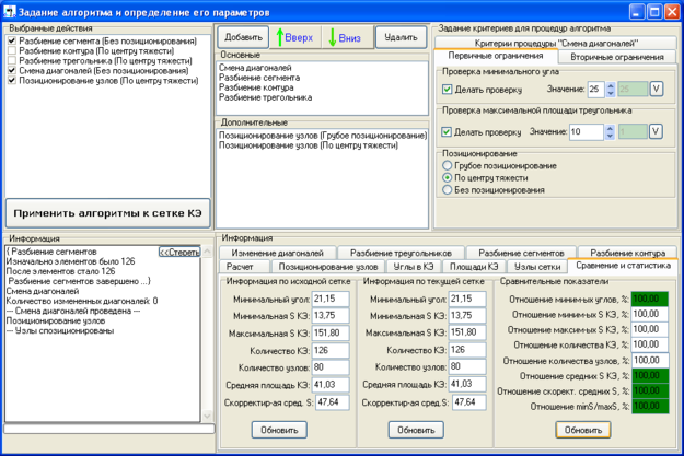 Р еализация алгоритма Рапперта проводится с помощью специальной подсистемы комплекса Sigma, разработанной дипломником Боковым П.Ю. в 2008 году. Созданная подсистема позволяет набирать алгоритм как бы из отдельных «кирпичиков», давая возможность исследователю использовать различные комбинации и последовательности выполнения отдельных стадий алгоритма для получения наиболее эффективной сетки. Кроме того, Боковым П.Ю. внесено несколько серьёзных дополнений (введение ограничений на площади конечных элементов, новый алгоритм работы с сегментами, возможность разного позицирования и т.п.), значительно повышающих эффективность базового алгоритма Рапперта.