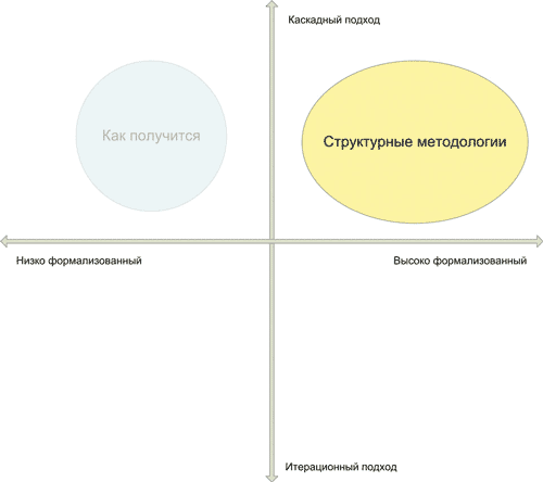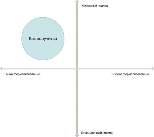 Увы, это самая сложная для описания категория — ведь в нее входят как продукт судорожных метаний новичка, пытающегося любой ценой выполнить свой первый проект, так и вполне зрелые и устоявшиеся методологии, вобравшие в себя многолетний и разнообразный опыт конкретных команд разработчиков и даже описанные во внутренних регламентах. Поскольку люди, способные разработать собственную методологию, как правило, могут сами оценить ее в плане итеративности и формализованности, будем ориентироваться на новичков. Увы, чаще всего это означает, что правил ведения разработки либо не существует вообще, либо они разработаны и приняты, но не выполняются. Естественным в таких условиях является крайне низкий уровень формализма разработки. Так что с этим все понятно.