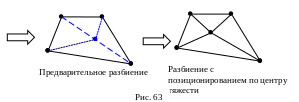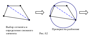 В отличие от процедур разбиения, которые будут описаны ниже, процедура смены диагонали не осуществляет повторной проверки всех элементов в случае замены диагонали, а переходит к проверке следующей. Данный подход выбран из соображений экономии времени и вычислительной мощности ЭВМ, а также основан на подходе к обработке элементов. Стороны элементов динамично меняются, при изменении диагонали, и это приводит к модификации последовательности узлов, образующих элемент, и расположения этих узлов. Результат всего этого представляется достаточно интересным.