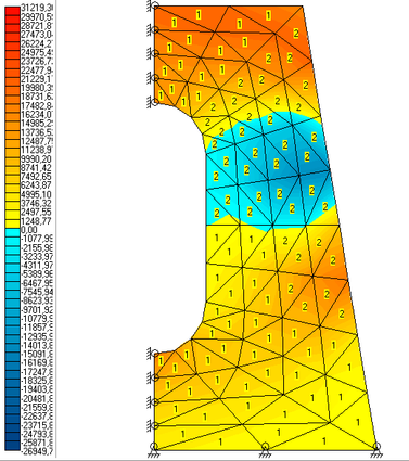 1. Исходная сетка при NRC=3 с указанием свойств КЭ (напряжения по Х).
