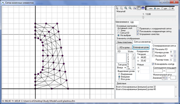 32 узла лежат на контуре пластины и были заблокированы изначально. 8 узлов, лежащих внутри контура, заблокировано самостоятельно. Получилось 40 блокированных узлов.