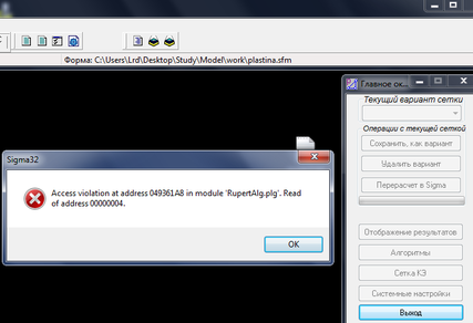 После расчета пластины в Sigma и попытки экспорта в подсистему Рапперта появилась сообщение, что сетка КЭ не может быть экспортирована. Окно подсистемы открылось, но кнопки в нём были не активны (кроме кнопки «выход»). При нажатии кнопки «выход» появлялась системная ошибка и закрыть подсистему и саму Sigm`у удалось только через диспетчер задач. Данная ситуация не носила систематического характера и проявилась лишь один раз.