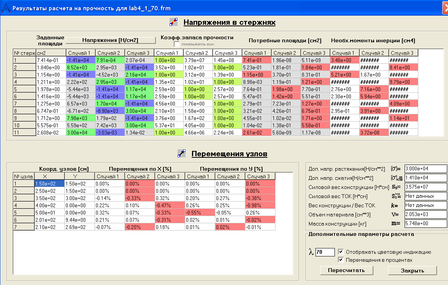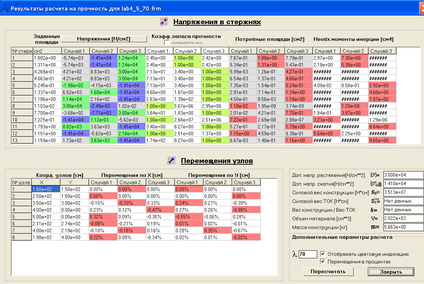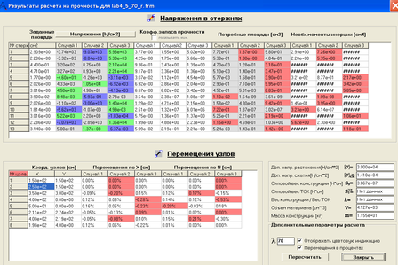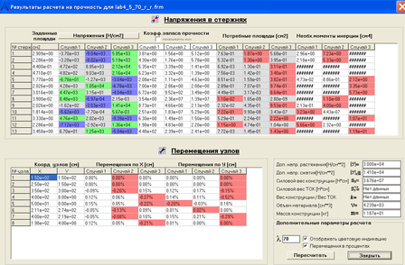 | После проведения параметрической оптимизации схемы lab4_5 из ЛР1 при λ=70 и заменим теоретические площади площадями стандартных элементов: lab4_5_70 m = 5,663 λ = 70 lab4_5_70_r_r m = 11,87 λ = 70 Расчет получившейся конструкции показал, что значения необходимых моментов инерции не превышают моменты инерции используемых стандартных элементов (труб). Максимальные перемещения узлов не превышают 0,52%, что подтверждает достоверность проведенного расчета. Масса конструкции увеличилась в 2,8 раза по сравнению с массой теоретической конструкции, спроектированной в ЛР1. Анализ эффективности работы стержней фермы