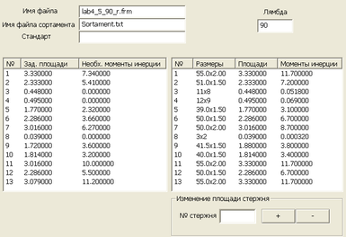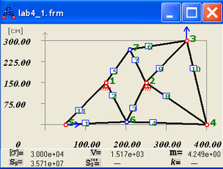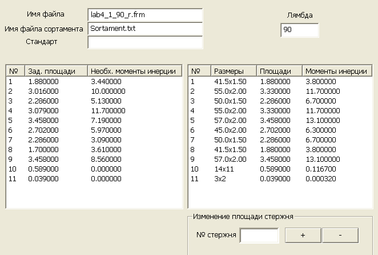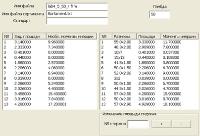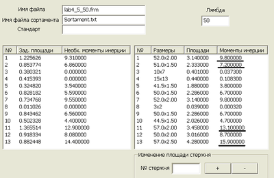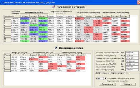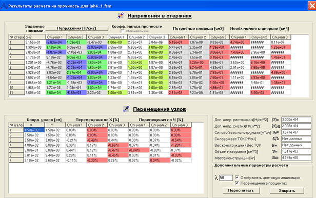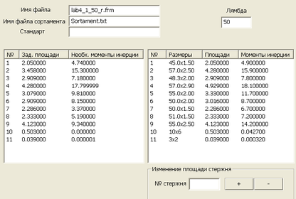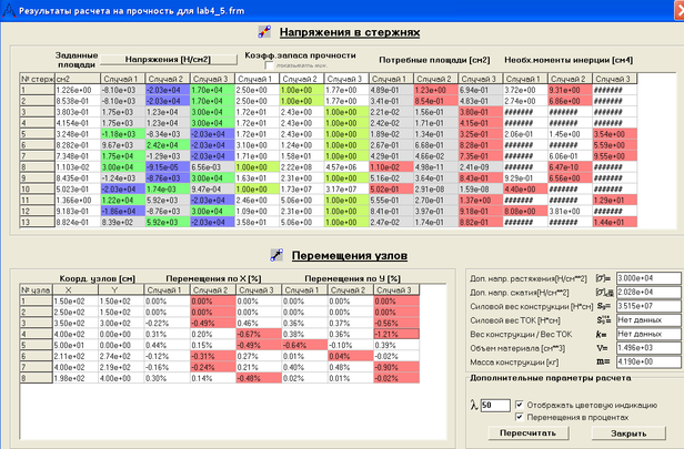 | После проведения параметрической оптимизации схемы lab4_1 из ЛР1 при λ=50 и заменим теоретические площади площадями стандартных элементов: lab4_1_50 m = 4,249 λ = 50 lab4_1_50_r m = 13,79 λ = 50 Расчет получившейся конструкции показал, что значения необходимых моментов инерции не превышают моменты инерции используемых стандартных элементов (труб). Максимальные перемещения узлов не превышают 0,45%, что подтверждает достоверность проведенного расчета. Масса конструкции увеличилась в 3,23 раза по сравнению с массой теоретической конструкции, спроектированной в ЛР1. Анализ эффективности работы стержней фермы