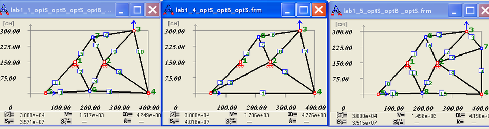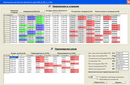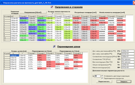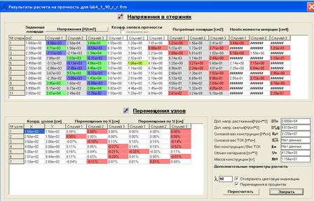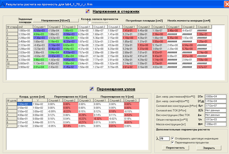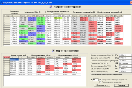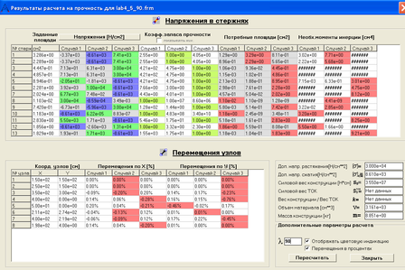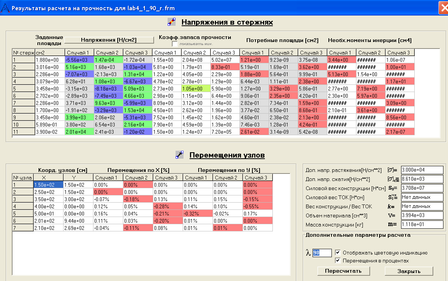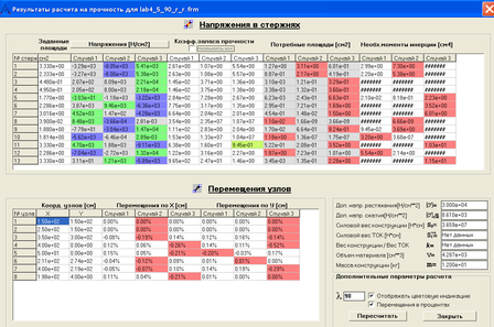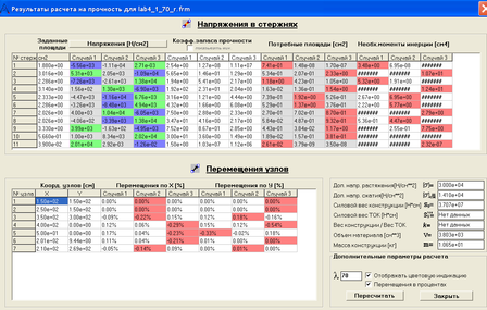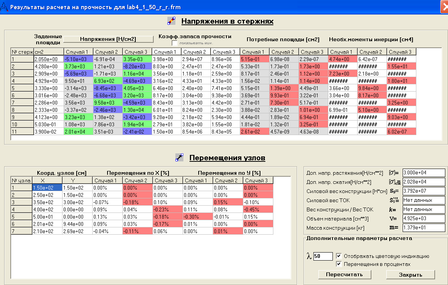 | После проведения контрольной параметрической оптимизации схемы lab4_1 из ЛР1 при λ=90 и заменим теоретические площади площадями стандартных элементов: lab4_1_90 m = 8.972 λ = 90 lab4_1_90_r_r m = 11,56 λ = 90 Расчет получившейся конструкции показал, что значения необходимых моментов инерции не превышают моменты инерции используемых стандартных элементов (труб). Максимальные перемещения узлов не превышают 0,49%, что подтверждает достоверность проведенного расчета. Масса конструкции увеличилась в 2,7 раза по сравнению с массой теоретической конструкции, спроектированной в ЛР1. Анализ эффективности работы стержней фермы