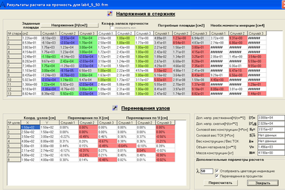 5 стержней из 13 (38%) имеют коэффициент запаса прочности больше 1.5, т.е. конструкция на 38% спроектирована нерационально, так как подобранные трубы имеют значительно большую площадь, чем необходимо. Выбор же именно этих труб обусловлен требуемыми значениями моментов инерции стержней для предотвращения их потери устойчивости. | |||||||||||||||||||||||||||||