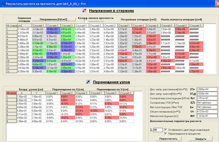| После проведения параметрической оптимизации схемы lab4_5 из ЛР1 при λ=50 и заменим теоретические площади площадями стандартных элементов: lab4_5_50 m = 4,190 λ = 50 lab4_5_50_r_r m = 14,26 λ = 50 Расчет получившейся конструкции показал, что значения необходимых моментов инерции не превышают моменты инерции используемых стандартных элементов (труб). Максимальные перемещения узлов не превышают 0,45%, что подтверждает достоверность проведенного расчета. Масса конструкции увеличилась в 3,4 раза по сравнению с массой теоретической конструкции, спроектированной в ЛР1. Анализ эффективности работы стержней фермы