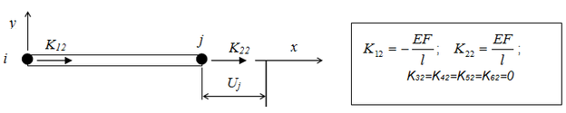 В строительной механике элементы матрицы жесткости имеют ясный физический смысл. Например, под элементом матрицы жесткости принимается реакция (усилие) стержня, возникающая в узле iпри единичном перемещении узлаj в одном из направлений координатных осей. Так, например для элемента, изображенного на правом рисунке, при перемещении узлаj в направлении, противоположном направлению оси y на единицу, в узлеiвозникает реакция в направлении оси Y.