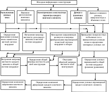 Приведем в качестве примера общую блок-схему расчета конструкций по методу конечных элементов для задач прочности.