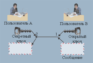 Пользователь B зашифровывает сообщение на открытом ключе пользователя A (который когда-либо передал его пользователю B).
