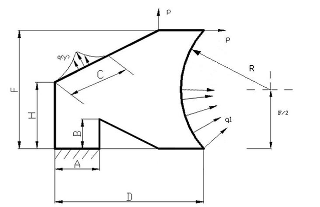 2. Погонная нагрузка постоянной интенсивности q1 =2000Н/см. распространяется на нижнюю и верхнюю части дуги окружности.