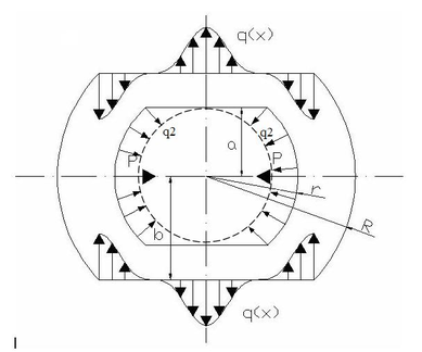 Горизонтальные нагруженные стороны заменить наклонными, соединив правые и левые точки горизонтальных сторон с точкой на вертикальной оси симметрии, отстоящей от центра пластины на расстояние 1.3b