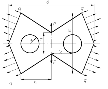 Ненагруженные верхние и нижние наклонные стороны заменить попарно дугами окружностей с центрами на вертикальной оси симметрии пластины, отстоящими от горизонтальной оси симметрии на расстоянии 2с, и радиусами, проходящими попарно через верхние точки пластины и нижние точки пластины.