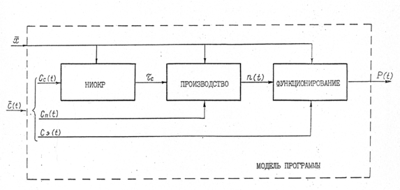 Пусть далее модель, состоит из блоков: блок функционирования парка численностью n самолетов, блок оценки длительности НИОКР и блок серийного производства. Тогда эта блочная модель может изображаться следующим образом (рис. 5).
