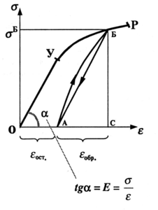 . Модуль упругости E, в соответствие с законом Гука, вычисляется как тангенс угла наклона прямого отрезка диаграммы