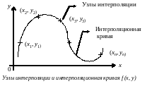редположим, что задано некоторое упорядоченное множество вещественных абcцисс х1, х2, ..., хn и связанное с ним множество вещественных ординат у1, у2, ..., уn. Пусть х1< х2< ...< хn и каждое уi есть некоторое вещественное число, отвечающее хi, которое определяется математически или в результате каких-либо наблюдений (см. рисунок). Точки (xi,yi) называются узлами интерполяции. Кривая, которая точно проходит через эти узлы, называется интерполяционной кривой.
