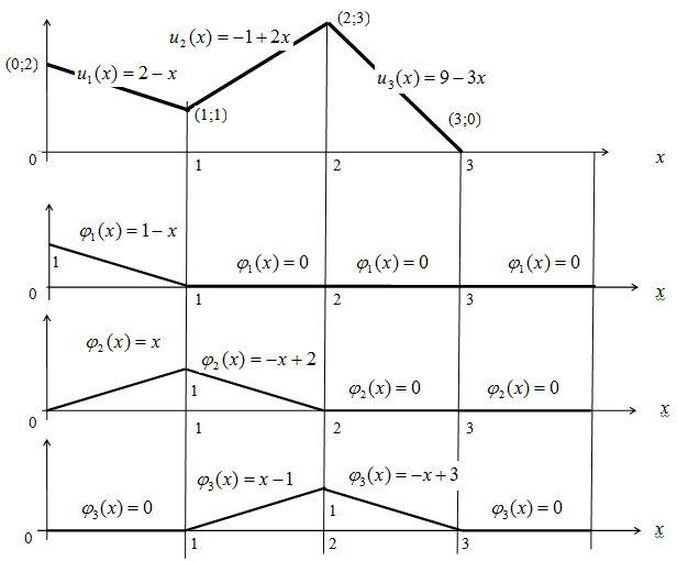 Поясним использование координатных функций более подробно, считая для определённости, что значения функции, которую мы представляем с помощью интерполирующих полиномов, нам известны в точках x0=0, x1=1 , x2=2 и х3=3 и равны, соответственно, значениям 2, 1, 3 и 0. (Понятно, что в реальной задаче значения функции как раз и надо найти, для чего и используется метод конечных элементов). Итак, на первом конечном элементе с начальной и конечной координатами по оси х, соответственно, равными х=0 и х=1 интерполирующий линейный полином должен проходить через точки (0; 2) и (1;1).