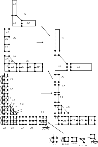 Из семи суперэлементов второго уровня собираются три подструктуры третьего уровня. Здесь суперэлемент 2.1.а в подструктуре 3.1 встречается также три раза, а его вектор узловых усилий использован один раз.