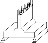 Пример. Требуется найти распределение напряжений в поперечном сечении сварного соединения.В этом случае можно ограничиться решением плоской задачи. Благодаря симметрии конструкции сварного узла, внешней нагрузки и условий опирания относительно вертикальной плоскости, можно сформулировать задачу для одной половины конструкции. При этом действие отброшенной части заменяется дополнительными граничными условиями, называемыми условиями заделки по симметрии.