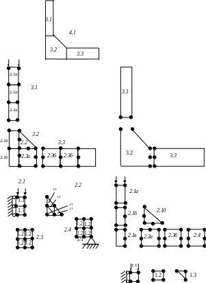 Для подструктуры 2.1 формируются три суперэлемента 2.1а, 2.1б, 2.1в, а для подструктуры 2.3 - два суперэлемента 2.3а и 2.3б, отличающиеся друг от друга числом и порядком расположения граничных узловых точек.