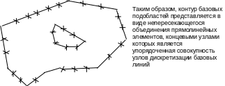 Две (или более) базовых линий могут иметь общие концевые точки (узлы). Таким образом, простейшим элементом топологической модели плоского континуума является точка, которая определяется порядковым номером и координатами. Другим элементом является базовая линия, которая также имеет свой порядковый номер с указанием номеров, образующих ее базовых узлов. Базовая подобласть, в свою очередь имеет номер с указанием номеров ограничивающих базовых линий.
