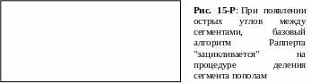 Для ликвидации подобных ситуаций автор алгортима предложил эвристическое правило: делить в таких случаях сегмент не посередине, а на ближайшей точке пересечения этого сегмента и концентрических окружностей с центрами в вершине угла (см. рис. 16-Р). Радиус каждой последующей окружности ровно вдвое больше радиуса предыдущей, а первая окружность берется произвольно, но достаточно малой, например r0 = 0.01. То есть радиус каждой i-ой окружности равен ri = r0 2 i.