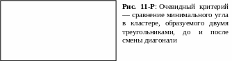 Следующий очевидный критерий можно получить сравнивая минимальные углы в двух треугольниках до и после смены диагонали, для предсказания эффективности этого действия (см. рис. 11-Р). Такой критерий является абсолютно адекватным, т.к. он совпадает с основным глобальным критерием сетки — критерием минимального угла и это его существенное преимущество.