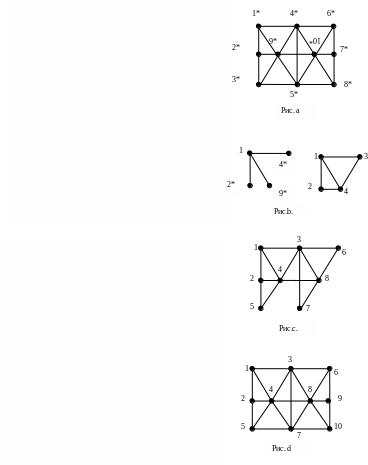 3. Повторить эту процедуру последовательно для каждой из вершин первого уровня - это значит сперва для вершины 2, затем - 3 и т.д. Для исследуемого гграфа еще неперенумерованной вершиной, смежной с вершиной 2 является вершина 3* - она становится вершиной 5. Смежными с вершиной 3 (которая сначала имела номер 4*) являются вершины 6*, 5* и 10*. В соответствии со степенью этим вершинам присваивают номер 6, 7 и 8 (Рис. c). Заметим, что вершины 5, 6, 7 и 8 связаны с вершиной 1 путем двойной длины и относятся ко второму уровню