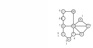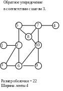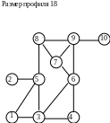Если выбрать в качестве стартовой вершину 8, хотя и имеющую минимальную степень, но не являющуюся периферийной, то получается упорядочение, показанное ниже с профилем, также равным 19. Полуширина станет равной 10.