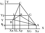 YL и YG - соответственно минимальная и максимальная ординаты узлов треугольника АВС; XL и XG - абсциссы точек пересечения прямой y=YP сторон треугольника АВ и ВС при YP>YB или сторон ВC и АC при YP<YB.