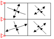 7. Потоки главных усилий. Хорошей наглядностью при анализе генеральных путей передачи усилий в конструкциях обладают потоки главных усилий в виде векторов. Их величины представляют собой главные напряжения, умноженные на толщины конечных элементов. Главные напряжения вычисляются по формуле: . Потоки главных усилий изображают на схеме КЭМ в центре каждого элемента. Положительный угол откладывают от оси Х против часовой стрелки, а отрицательный — по часовой стрелке. Длина каждого вектора в выбранном масштабе соответствует величине силового потока. Сходящиеся стрелки означают сжатие, расходящиеся — растяжение.