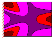 6. Точечные изображения. Для анализа распределения каких-либо величин весьма наглядные изображения можно получить при использовании точечных изображений. Каждый элемент сетки КЭМ заполняется определенным количеством точек, число которых пропорционально величине изображаемой характеристики на данном элементе и относительному размеру самого элемента. Подобные картины обладают той же наглядностью, что и тоновые изображения и не требуют цветного монитора. Точечные изображения могут накладываться на линии равного уровня. При этом наглядность точечного изображения сочетается с количественной информацией линий равного уровня.