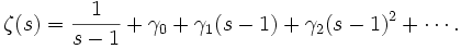 The Riemann zeta function is meromorphic with a single pole of order one at s = 1. It can therefore be expanded as a Laurent series about s = 1; the series development then is
