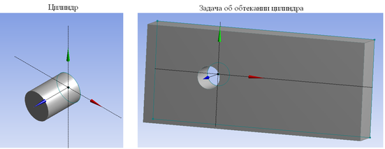 Сразу же сделаем важное разъяснение. Дело в том, что в ходе расчёта течений газов и жидкостей прежде всего нас интересует построение геометрии самого объёма жидкости или газа, а не обтекаемого тела. Вследствие этого во многих задачах, где предметом интереса является только расчёт течения (без учёта процессов происходящих в самом твёрдом теле), геометрия и сетка строится только для жидкого объёма. При этом твёрдое тело представляется в виде «полости» в этом жидком объёме (см. рисунок 3.2.4)