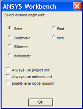 Как видно из рисунка, можно выбрать различные единицы измерения: метры (Meter), сантиметры (Centimeter), миллиметры (Millimeter), микрометры (Micrometer), футы (Foot) или дюймы (Inch). Программа позволяет также использовать единицы измерения, которые можно установить для всего проекта Workbench (по умолчанию это метры) – для этого необходимо установить галочку напротив «Always use project unit». Существует возможность подтверждения применения выбранной единицы измерения ко всему проекту по умолчанию. Для этого необходимо поставить галочку в окне «Always use selected unit».Наконец, можно подключить поддержку больших моделей, вплоть до 1000 км3 – галочка «Enable large model support».
