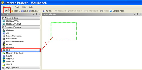 Для демонстрации работы Workbench создадим проект на примере гидродинамического расчёта. Для иллюстрации возможностей построения связей различных частей проекта, сделаем его состоящим из двух частей. В первой части проекта будет строиться геометрия и импортироваться сетка, а во второй будет проводиться настройка расчёта с использованием сетки, оттранслированной из первой части проекта.
