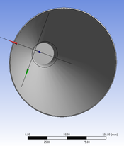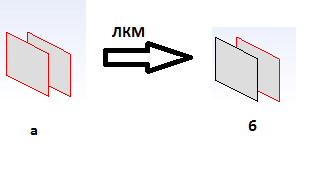 Чтобы выбрать закрытую от нас внутреннюю поверхность сопла, нам необходимо кликнуть на второй из двух представленных в интерфейсе плоскостей, так, что они обе станут красными (см. рисунок 3.2.14а). После этого нужно нажать на переднюю поверхность ЛКМ, чтобы её рамка стала чёрной (см. рисунок 3.2.14б).
