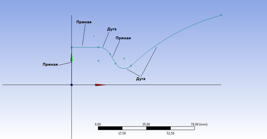 Начнём рисование из центра координат, проведя прямую линию. Размер в данном случае пока не имеет значения. После этого нарисуем горизонтальную линию, выходящую из конца вертикальной. Затем – дугу, касательную к нашей прямой. После этого прямую, касательную к дуге, а затем две последовательных касательных дуги.