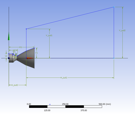 Во многих задачах, особенно связанных со сверхзвуковыми течениями, помимо расчёта процессов внутри конструкции бывает необходимо учесть процессы, происходящие в окружающей среде. Поэтому, изображая «тело» течения, мы захватим не только внутреннюю полость сопла, но и часть внешнего потока, куда истекает реактивная струя.