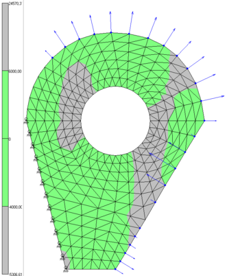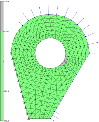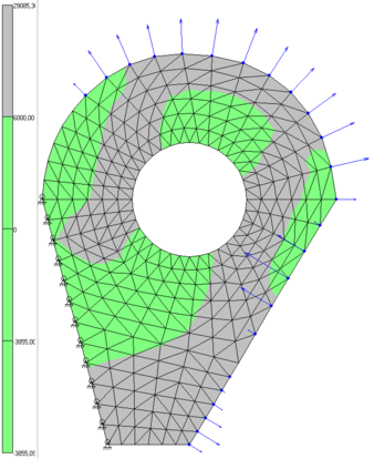 | Результирующая картина областей повышенных, средних и пониженных значений напряжений. Красным и Синим цветами выделены подобласти повышенных значений напряжений, при этом синим цветом - значения сжимающих напряжений. Зелёным цветом выделены подобласти пониженных значений напряжений. | ||