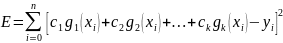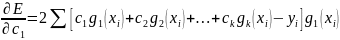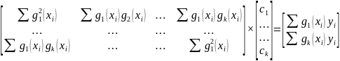 Так как элементы матрицы в левой части и вектора – столбца правой определяются табличными данными, то выписанная система k линейных уравнений с k неизвестными может быть решена. Можно выбрать любую функцию g(x), лишь бы она линейной относительно своих коэффициентов. Фактический выбор функции должен осуществляться с учетом специфики табличных данных, под которой понимается их периодичность, экспоненциальный или логарифмический характер, свойства симметрии и наличие асимптотики.
