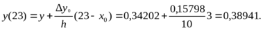Пусть требуется решить этот пример 1 методом Эйткена. Ниже приведена таблица результатов, полученных путем многократного применения линейной интерполяции при x =23°. Видно, что по мере выполнения вычислений значения у (23°) стремятся к истинному значению, равному 0,39073.
