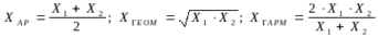 Для того, чтобы выбрать теперь вид аналитической зависимости, которая наилучшим образом соответствует исходным экспериментальным данным, поступим следующим образом. Выполним промежуточные вычисления. На области определения независимой переменной (мы ранее условились, что это будет хi ) выберем две точки, достаточно надежные и по возможности как можно дальше отстоящие друг от друга. Обозначим их Х1 и Х2. Этим точкам соответствуют значения Y1 и Y2. Найдем теперь среднее арифметическое, среднее геометрическое и среднее гармоническое для выбранных точек: