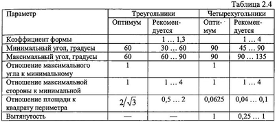Для четырехугольных элементов следует ограничить их стремление к «игольчатой форме», для чего используется такой измеритель, как вытянутость. Используются и другие измерители, данные о которых приведены в таблице 2.4, где также указаны рекомендуемые и оптимальные значения соответствующих мер качества.
