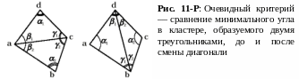 Следующий очевидный критерий можно получить сравнивая минимальные углы в двух треугольниках до и после смены диагонали, для предсказания эффективности этого действия (см. рис. 11-Р). Такой критерий является абсолютно адекватным, т.к. он совпадает с основным глобальным критерием сетки — критерием минимального угла и это его существенное преимущество.