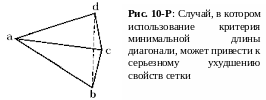 ервый, возможно самый очевидный критерий — это длина диагонали (см. рис. 10-Р). Действительно, зрительно, диагональ ac кажется гораздо более удачной диагонали bd для минимального угла двух треугольников и поменяв эту диагональ мы, вероятно, добьемся улучшения свойств сетки. У этого способа, к тому же, есть преимущества: он не трудоемок в вычислительном плане и его просто запрограммировать. Но есть у него и критический недостаток — он неадекватен. На рисунке 10-Р показан случай, где использование критерия минимальной длины диагонали может привести к серьезному ухудшению свойств сетки.
