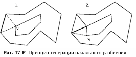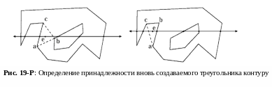 Первый треугольник генерируется от любого сегмента внешнего полигона, а третья точка выбирается также как и для грани. Для первой проверяемой точки устанавливается принадлежность центра треугольника, образуемого этой точкой и сегментом, телу конструкции (см. рис. 19-Р), т.е. лежит ли треугольник внутри контура. Для этого, через этот центр проводится прямая, параллельная оси X и находятся все ее точки пересечения с сегментами.Далее эти точки сортируются по мере возрастания координаты X и формируются интервалы. Каждый нечетный интервал принадлежит контуру.