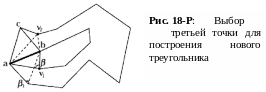 ритерием для оптимального выбора третьей точки треугольника является угол, под которым видна грань из этой точки, т.е. угол образуемый двумя лучами, выходящими из выбираемой точки и проходящими через концы грани. Для каждой грани выбирается такая точка, для которой этот угол максимален. Такой выбор критерия позволил сэкономить время на том, что нет необходимости проверять вновь создаваемые грани на пересечение с уже существующими. Для того, чтобы сразу исключить проверки, подобные проверке точки, перед перебором всех точек устанавливается с какой стороны лежит третья точка треугольника, которому принадлежит грань ab (точка c, см. рис. 18-Р). Каждая точка проверяется на то, с какой стороны от грани ab она находится. Другими словами, эта проверка исключает пересечение площадей с уже существующими треугольниками. Несмотря на то, что точное обоснования этой особенности отсутствует, тем не менее, такой подход надежно работает.