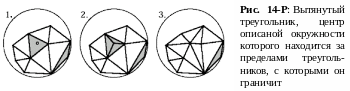 торой недочет заключается в том, что не учитывается возможность существования таких треугольников, у которых центр описанной вокруг них окружности находится далеко от самого треугольника. В таком случае, при делении треугольников с наименьшим углом в первую очередь, возникает следующая ситуация (см. рис. 14-Р). При первом разделении такого треугольника добавляется точка в центр описанной вокруг него окружности, но так как точка находится далеко от самого треугольника, то сам треугольник не претерпевает никаких изменений и он по-прежнему остается первым в очереди для разбиения.